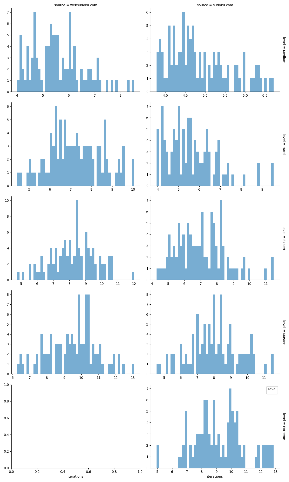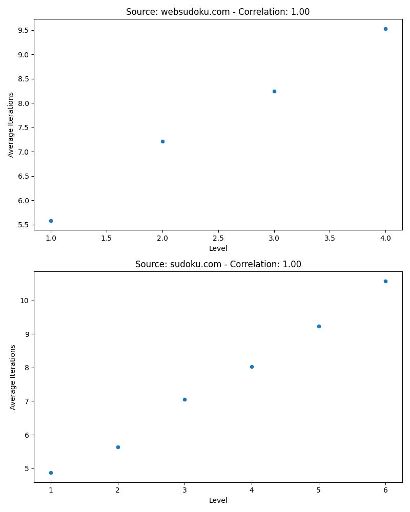 As we can see, they all correlate almost perfectly with the brute force having a perfect 1.0 correlation, making it highly likely that the websites use the iteration count as well for their level determination - and this makes the whole analysis problematic, as we still don't know if this is actually a good difficulty indicator for how a human perceives the difficulty. Actually solving Sudokus by a human and rating them by the time to get a ground truth is left as an exercise for the reader (Sorry I'm not paid for this.)