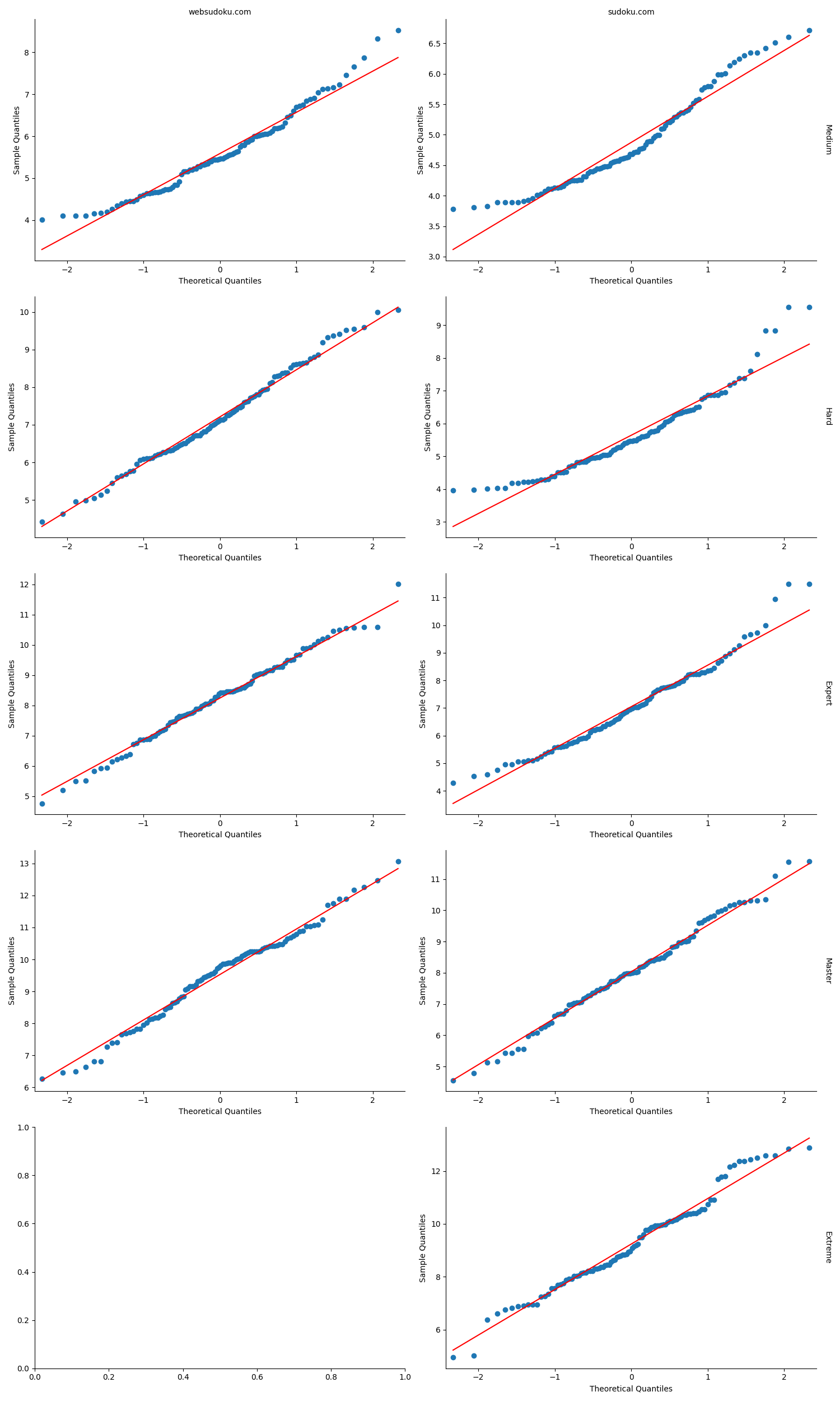 For all the charts, I used the logarithm on the iterations as especially the qq plot made it very obvious that the iterations count is exponential to the difficulty. Which is not surprising as solving Sudokus is famously NP hard. Any currently known algorithms to solve an NP-hard problem take exponential time.